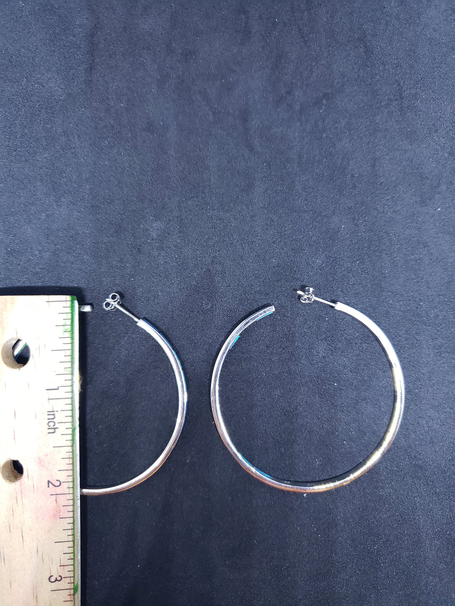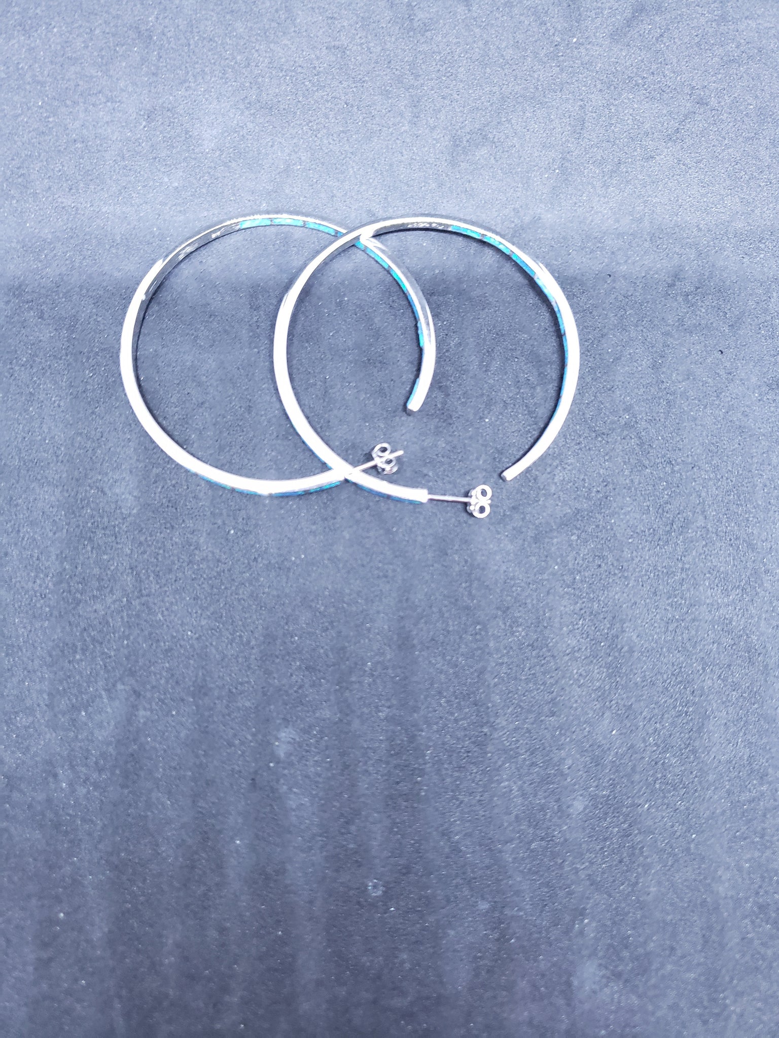 2 inches round Inlay blue fire opal sterling silver hoop earrings Handmade in USA