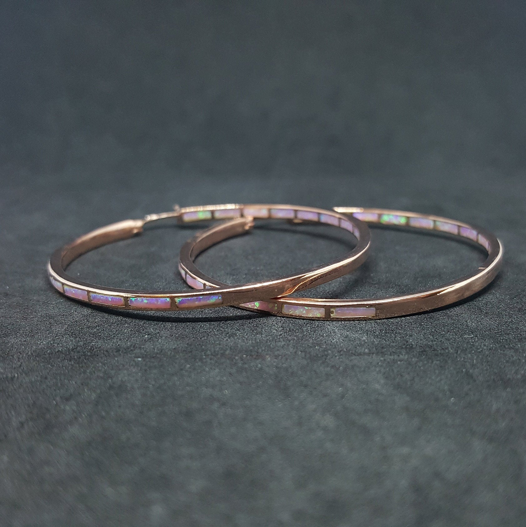 2 inches round Inlay white fire opal rose gold plated sterling silver hoop earrings Handmade in USA